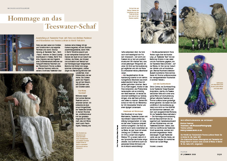 In den Porträts stellen wir drei Künstlerinnen vor, die unterschiedlicher kaum sein könnten, auch wenn das Medium Filz sie alle verbindet. Beate Bossert, die Mitbegründerin dieser Zeitschrift, hat in den dreißig Jahren auf ihrem „Filzweg“ viele Techniken und Ausdrucksformen erprobt – von Gnomen und Wichteln über die naturgetreue Darstellung von Früchten und Konfekt bis zu hauchzarten Nunoschals und Kunstwerken für Ausstellungen. Ganz der Mode verschrieben hat sich Diana Nagorna, die nicht nur exquisite Kleider und Accessoires kreiert, sondern ihre Modelle auch selbst fotografisch in Szene setzt. Yaroslava Troynichs hinreißende Hand- und Fingerpuppen – vom Schaf bis zum Schnabeltier, vom Fuchs bis zum Frosch – erzeugen bei Jung und Alt augenblicklich gute Laune und werden auch in der Therapie eingesetzt.