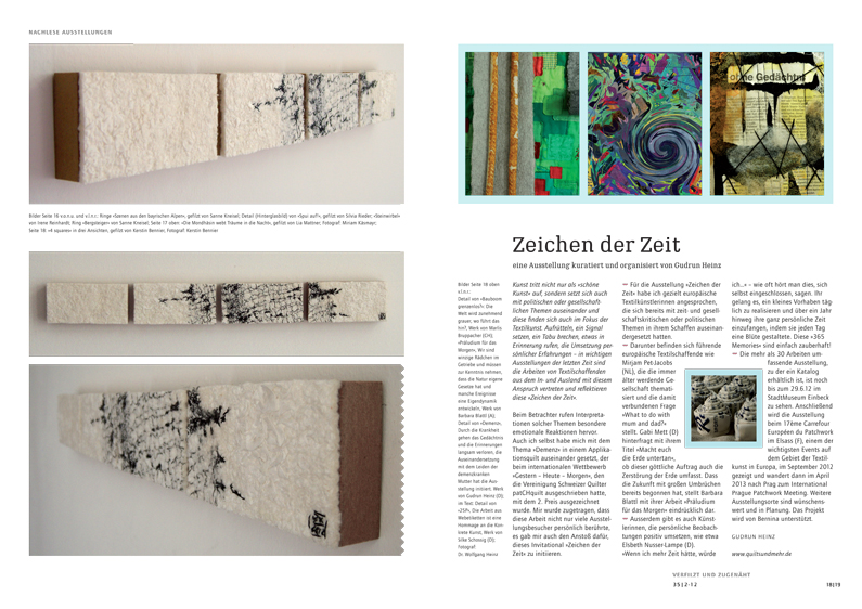 The connection between wool and gold is one of the main interests of Karen Betty Tobias. She has explored the blessed material and was surprised, which phantastic results are possible. With all of her experience about gold and felt she instructed an intensive workshop at the 17. German Felter´s Meeting, from which you also get reports in this issue. Like the theme of the meeting, the FUN looks with her readers »With a Stovepipe Into the Mountains«. You can read about the highlights of the meeting, the exhibiton at the »Dorfgalerie Grainau«, a traditional Bavarian Evening, a journey to the picture-perfect Eibsee and the intensive workshops like the one by Birgit Nurtsch, where the members felted a »Kraftgürtel« (Power Belt) which is supposed to warm up the female center.